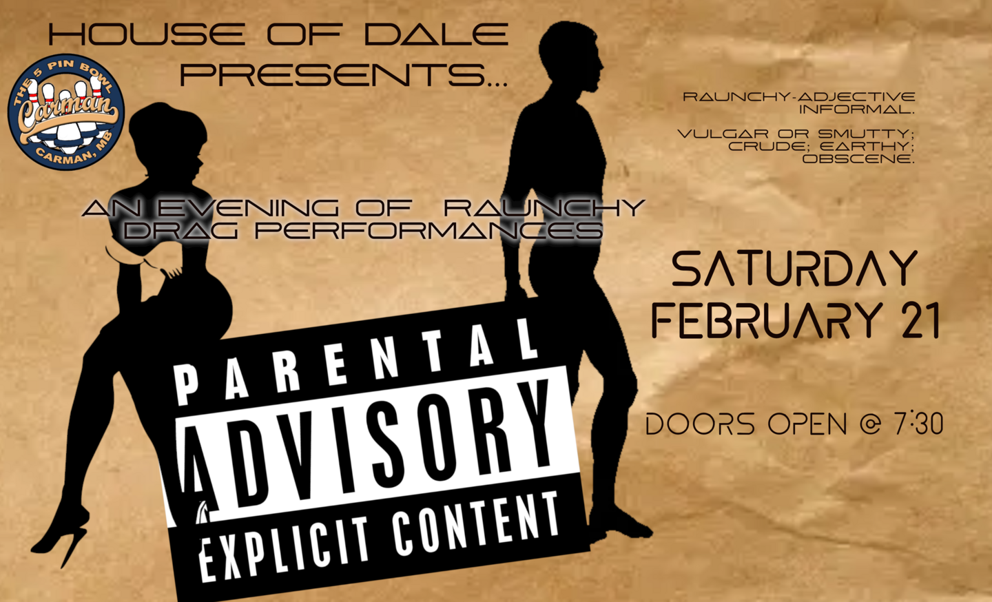 The House of Dale returns to the Carman 5 Pin Bowl with an Adults Only Evening of raunchy drag performances...